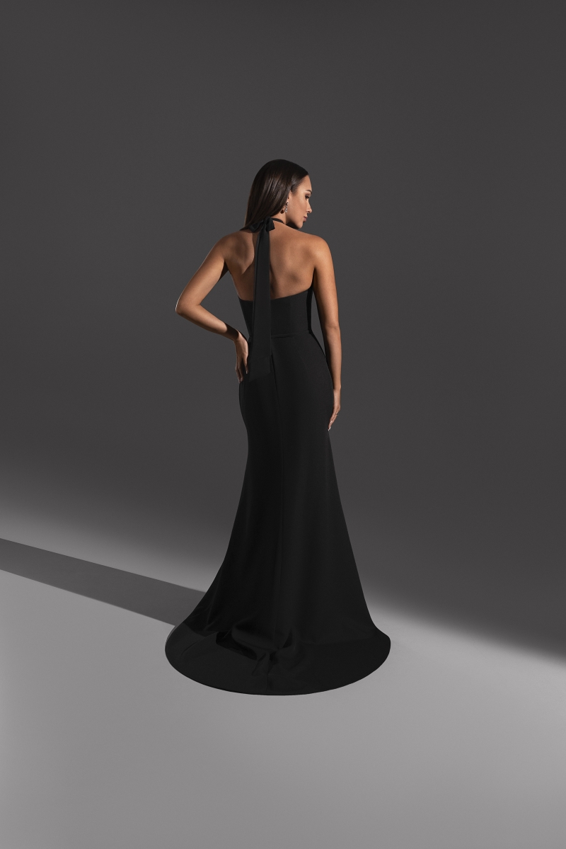 Воротник-стойка вкупе с закрытым передом создают контраст между соблазнительным вырезом сзади, открывающим спину. Юбка оформлена боковым разрезом до середины бедра и шлейфом, добавляющем драматичности каждому шагу.