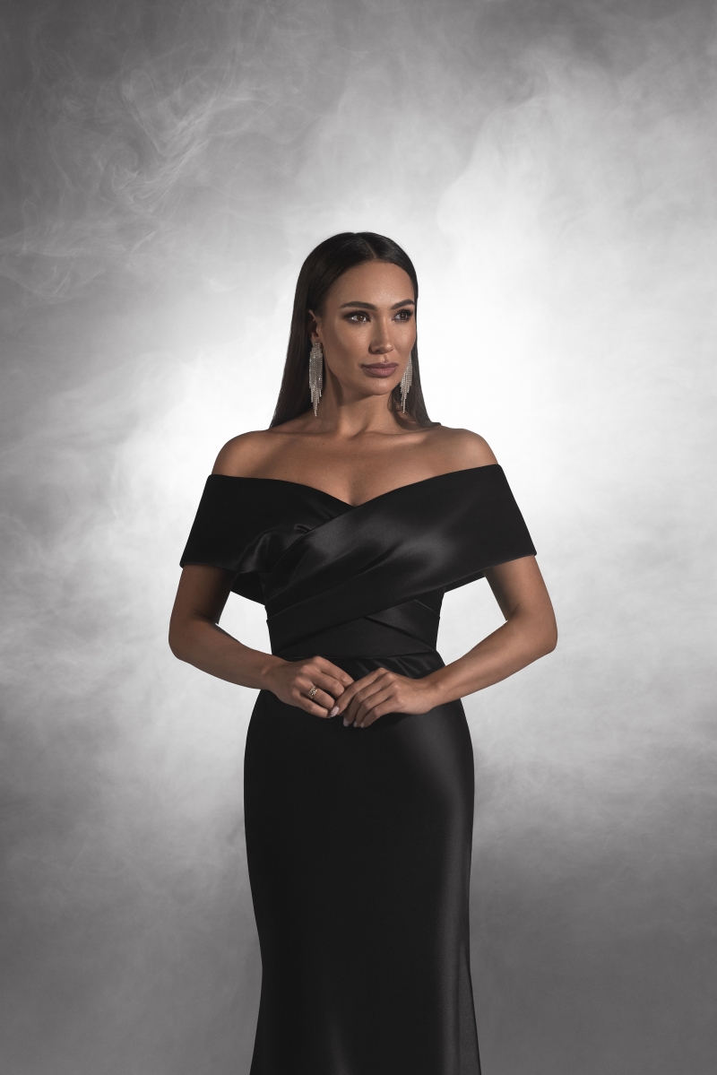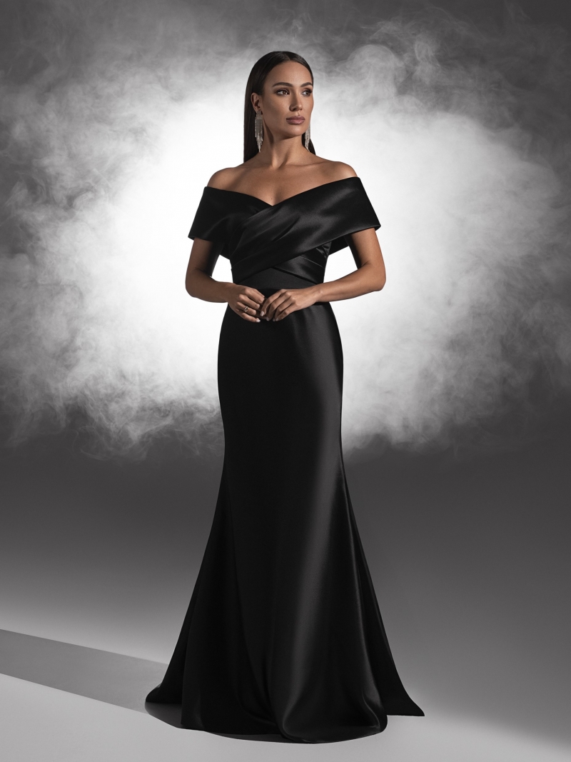 Вечернее платье с открытыми плечами – это воплощение утонченной элегантности. Его глубокий черный цвет, словно ночное небо, добавляет загадочности и шика.
