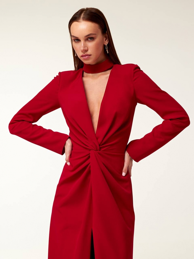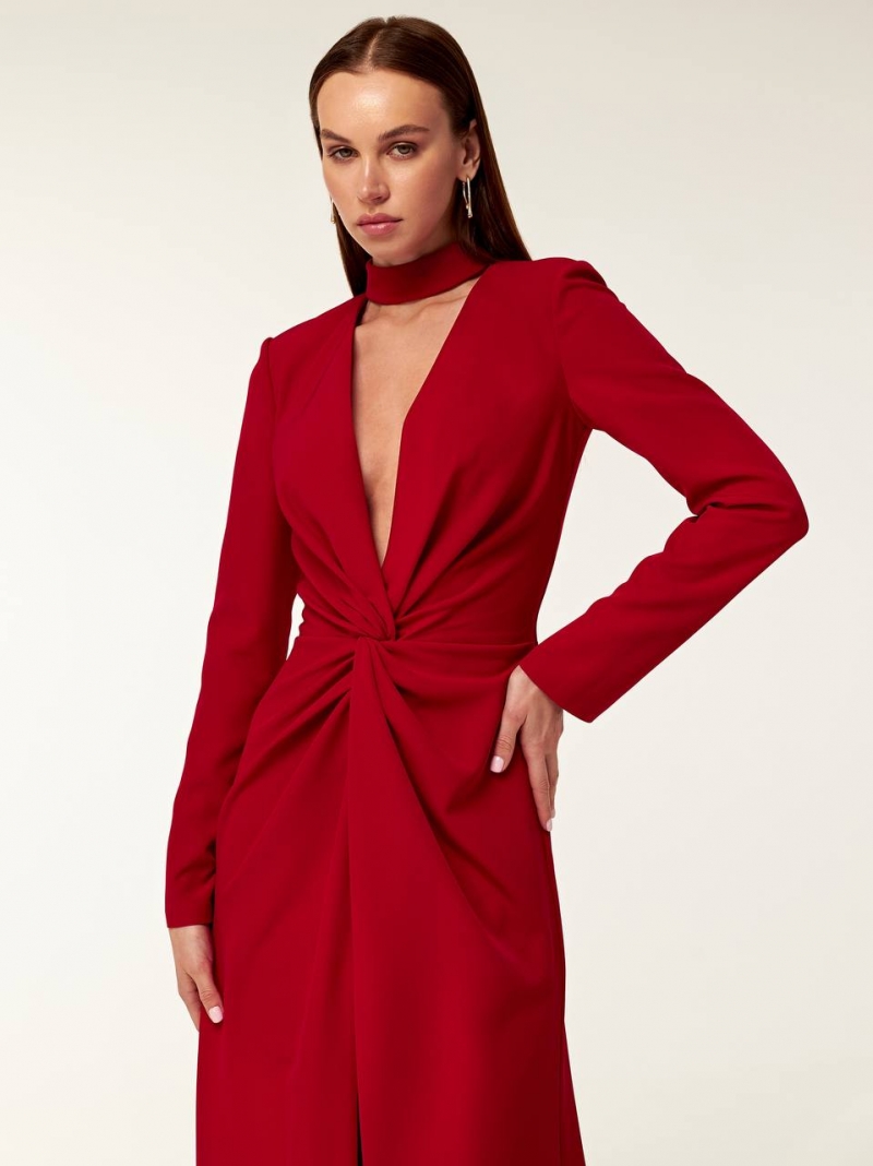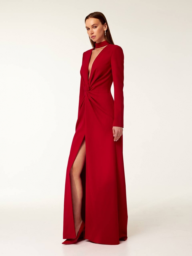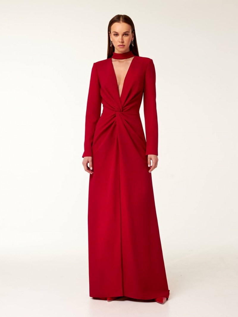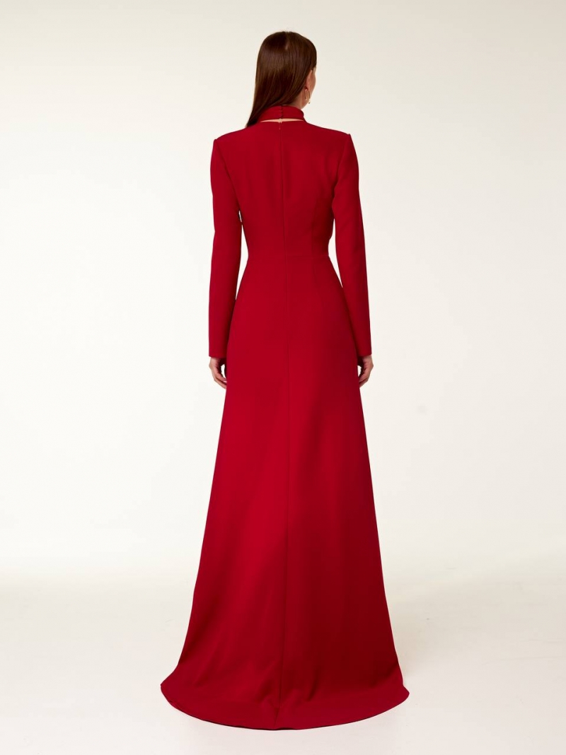 Красное вечернее платье Эльмира небанальное и современное. Верх пиджачного кроя с длинными рукавами создает строгий, но при этом женственный образ.