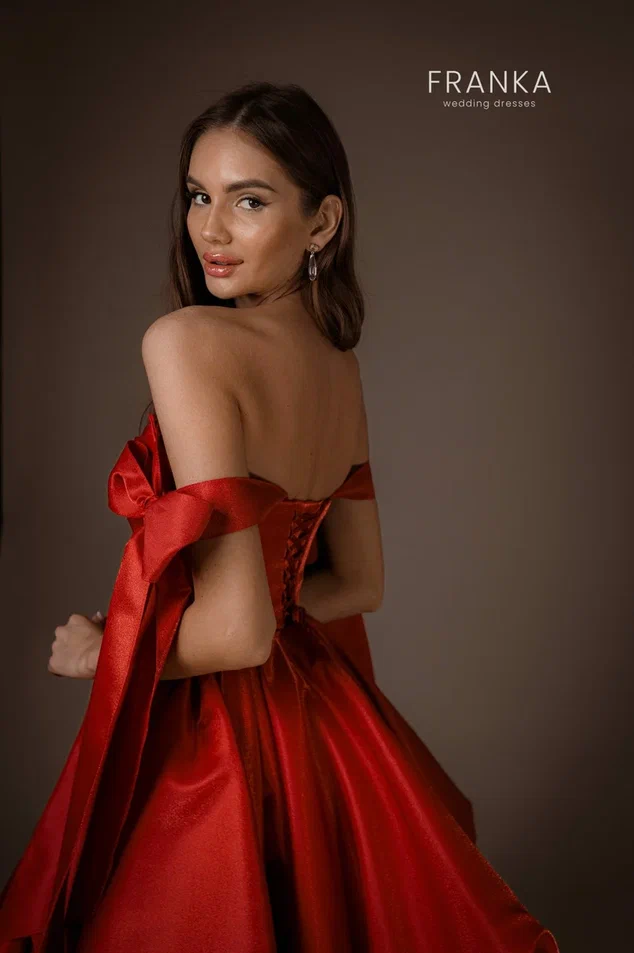 Вечернее платье с открытой спиной и шнуровкой сзади идеально садиться по фигуре. Оригинальные рукава-бантики придают модели уникальность и шарм, создавая эффект легкости и романтики. Пышная короткая юбка со множеством складок добавляет объема и динамики, позволяя свободно двигаться и танцевать. Дорогие переливы атласа подчеркивают текстуру ткани и делают вечернее платье напрокат по-настоящему роскошным, отражая свет и привлекая взгляды.