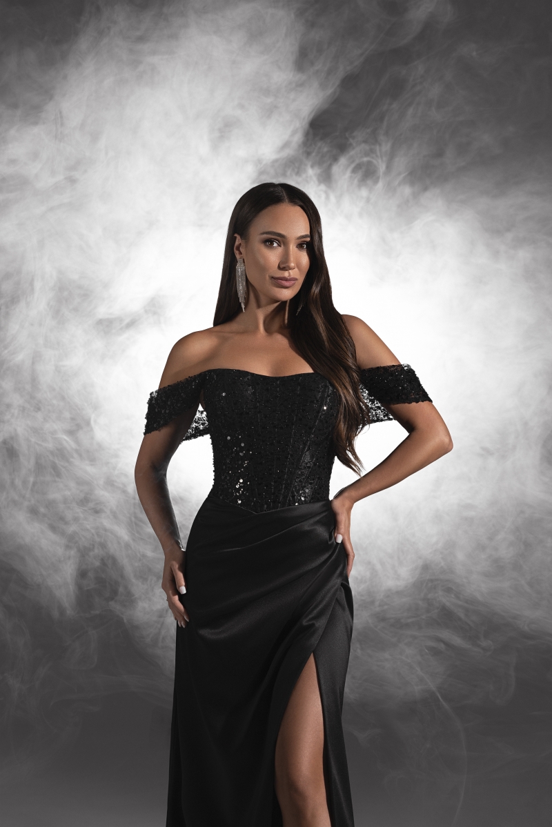 Платье на выпускной Крис выполнено в элегантном черном цвете и имеет стильный корсетный верх, который акцентирует внимание на фигуре. Приспущенные широкие бретели добавляют наряду нотку романтики. Хаотично рассыпанные пайетки на корсете и бретелях придают наряду завораживающий блеск, который будет выигрышно смотреться на фото и видео.