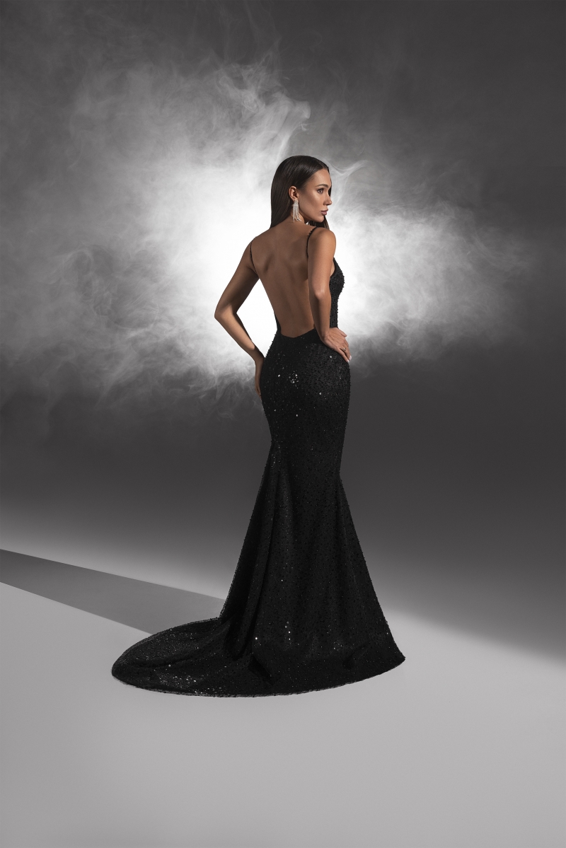Глубокий V-образный вырез, доходящий до талии, и открытая спина делают образ интригующим и соблазнительным. Юбка платья заканчивается акцентным шлейфом, который добавляет нотку драмы и романтики.