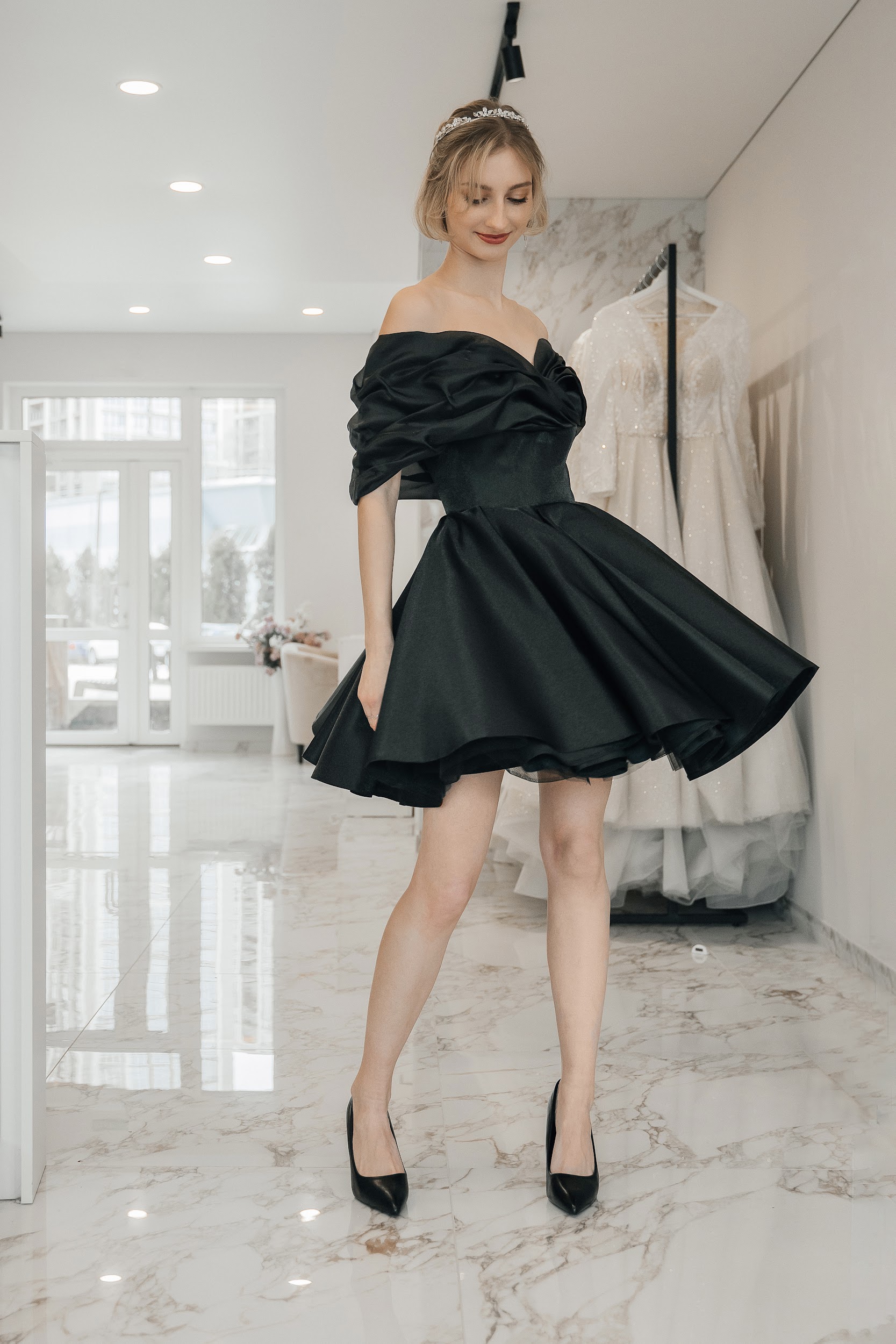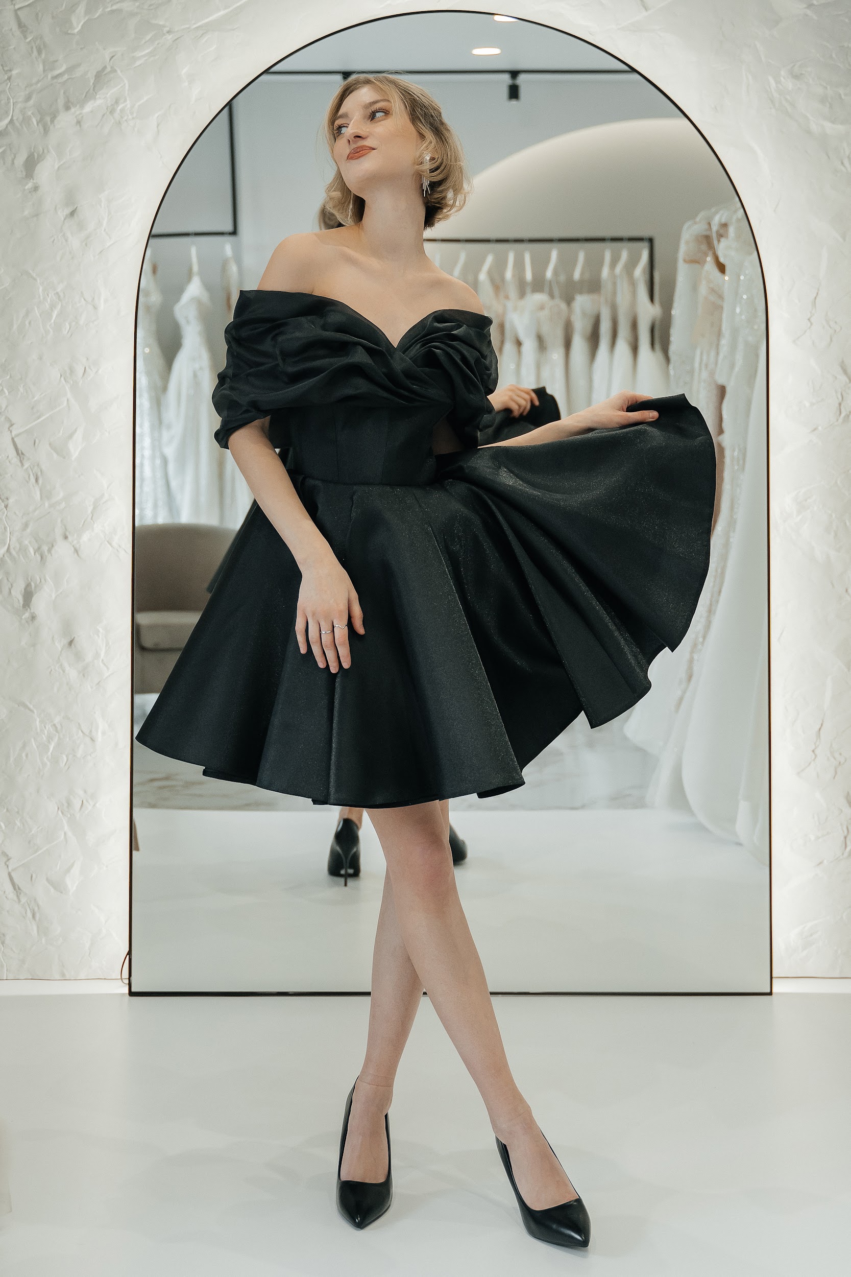 Неповторимое черное платье привлекает внимание благодаря своему дизайну. Корсет с декольте в форме сердечка изящно обнимает фигуру, а драпировки, плавно переходящие на открытые плечи, добавляют нотку романтики и женственности.