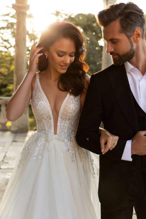 - свадебное платье с открытой грудью с V-образным вырезом – элегантная и соблазнительная модель, подчеркивающая грудь;