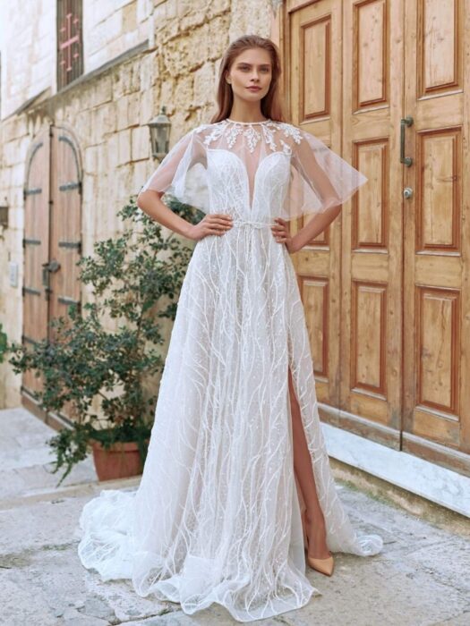 Идеальный выбор для свадьбы в прохладное время года или для венчания, где требуются закрытые плечи. Кружевные рукава легко отстегиваются, когда вы заходите в теплое помещение, а съемные бретели позволяют менять линию декольте в течение дня.