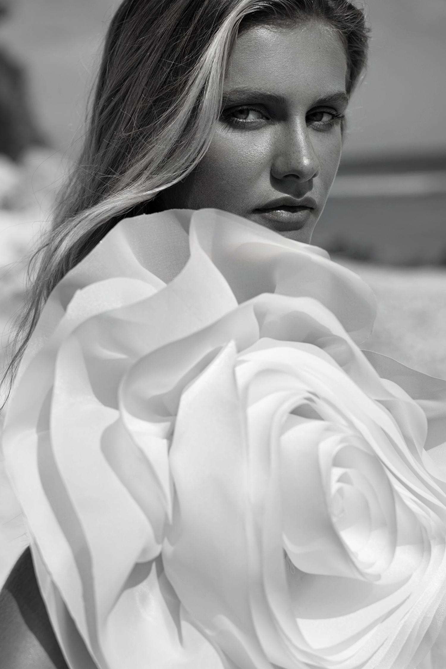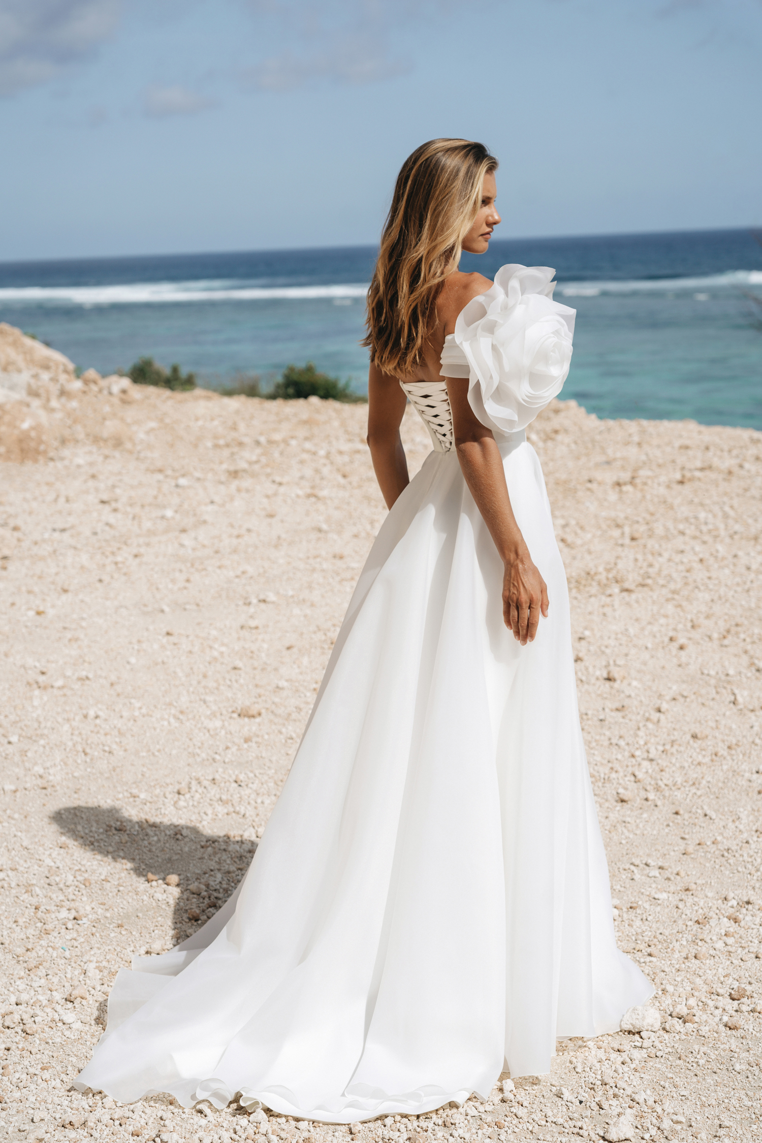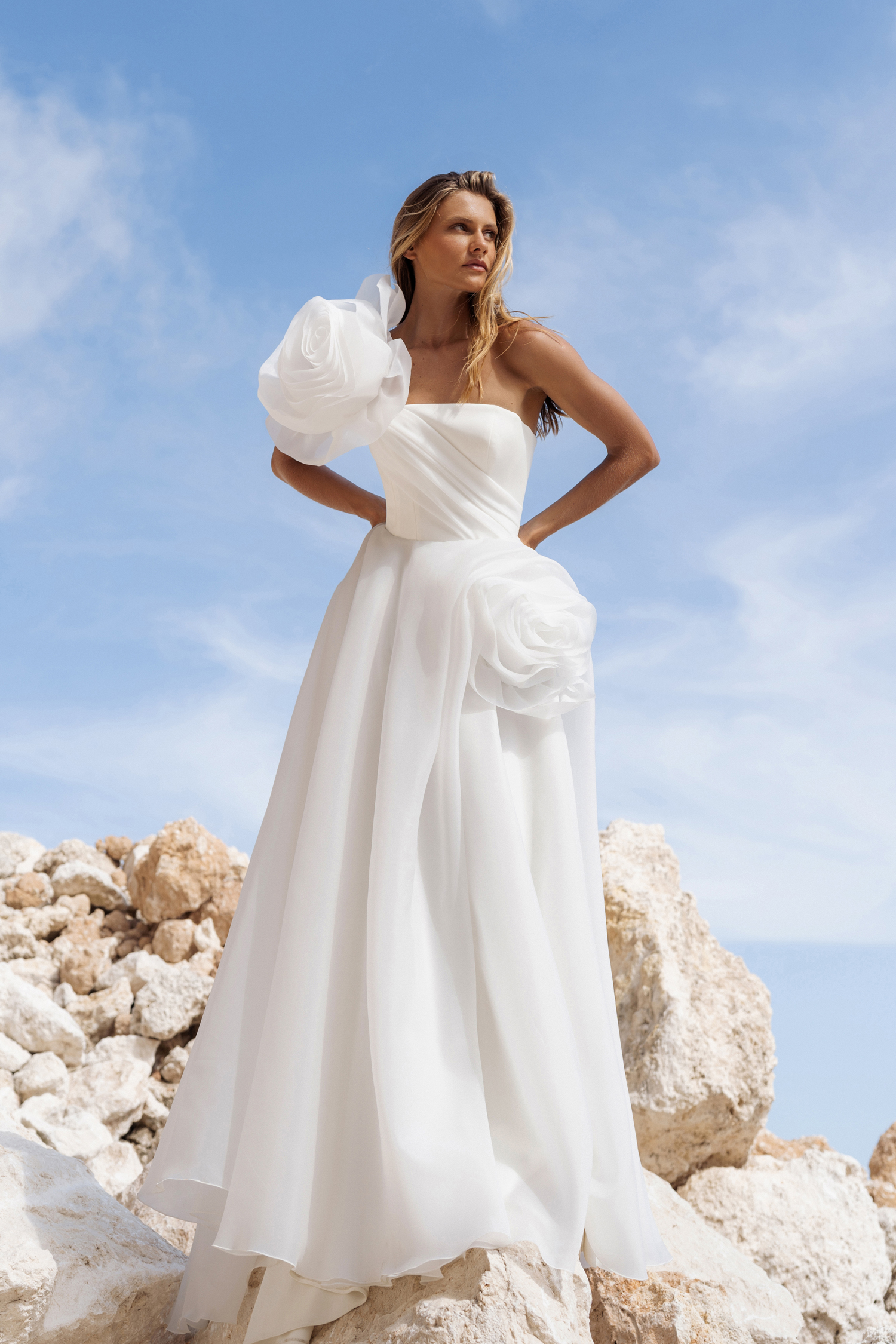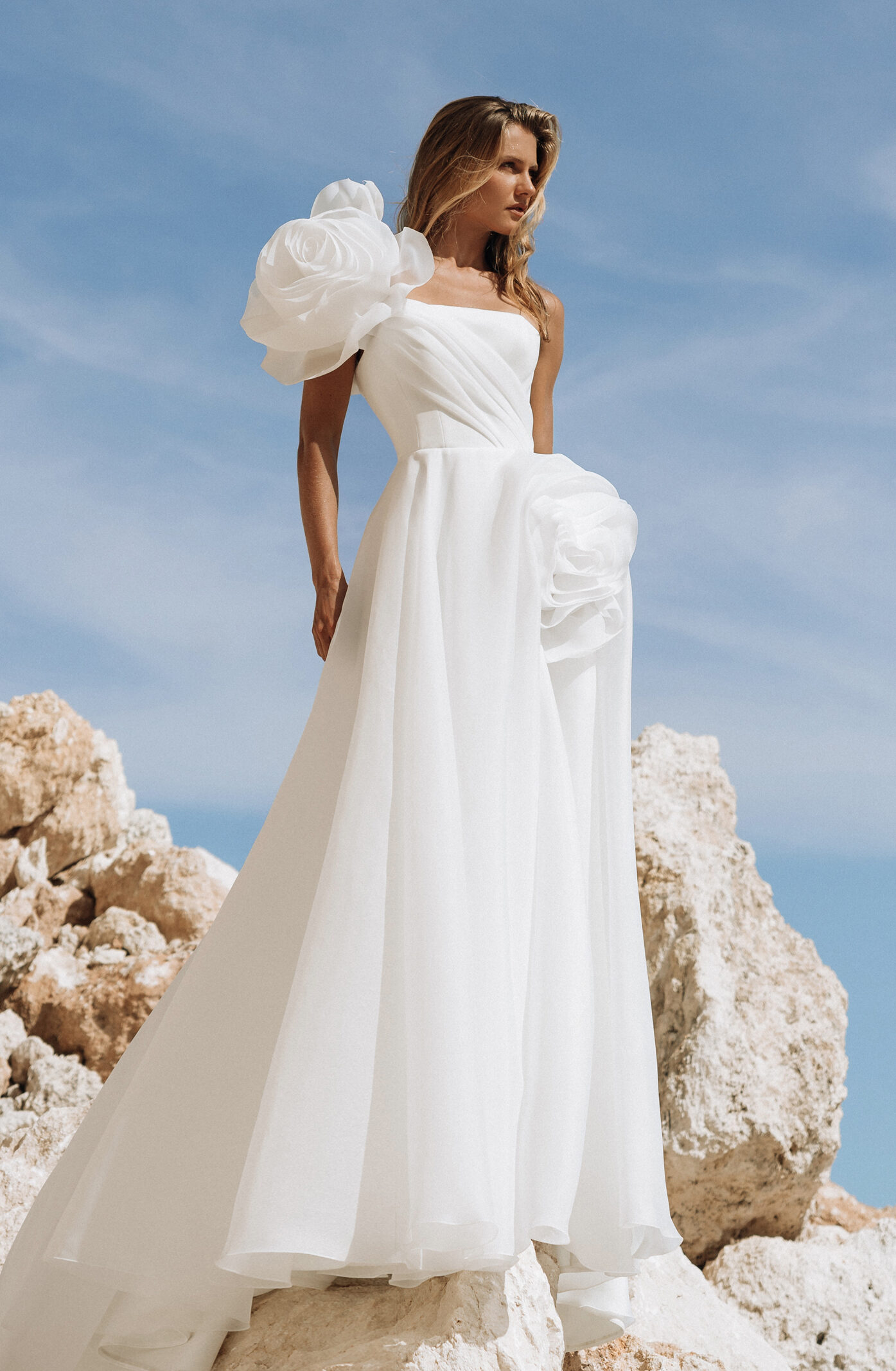 Платье из белой органзы Lissa просто создано для того, чтобы покорять! Небанальная модель, украшенная акцентными цветами, затмит своим великолепием всех вокруг.