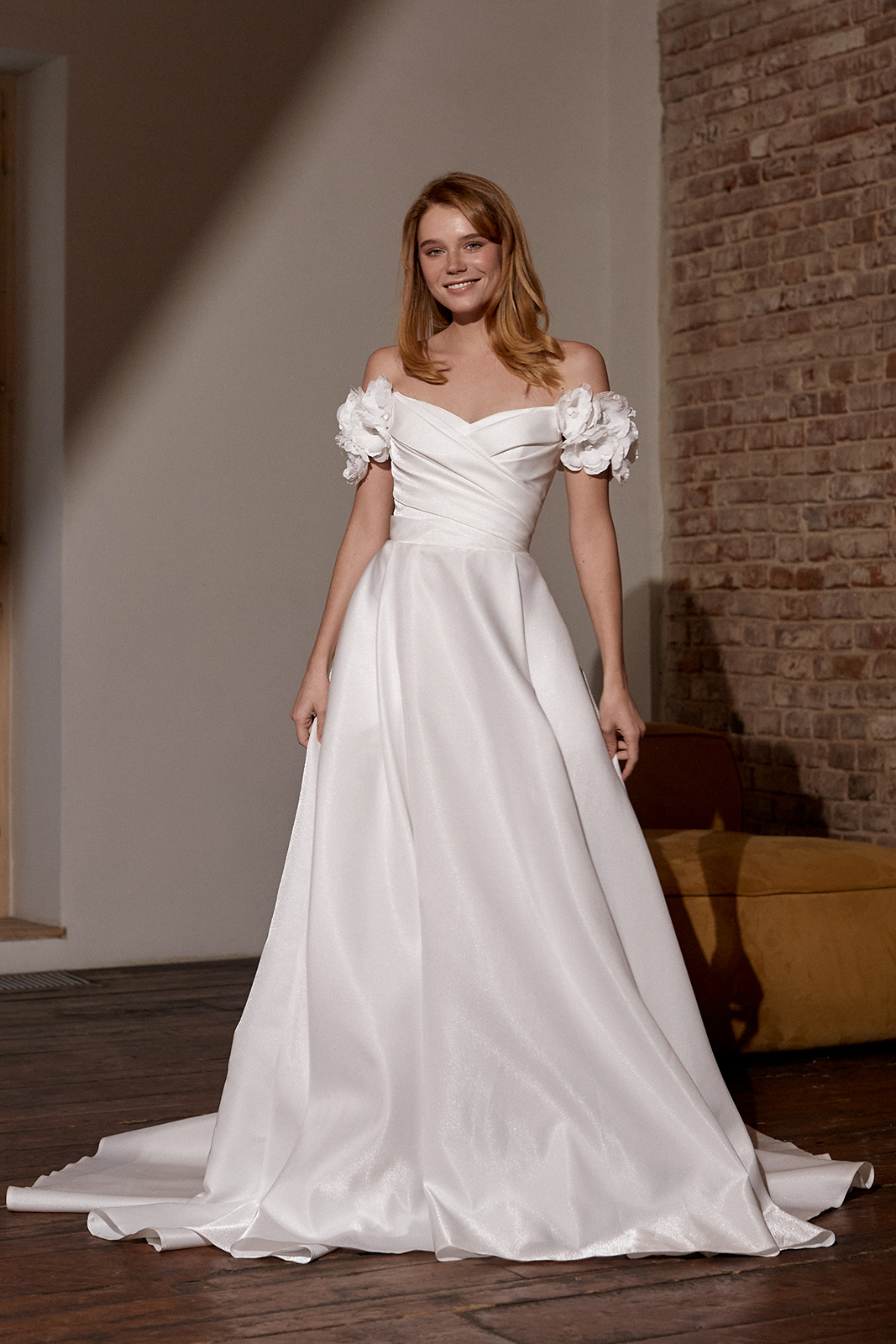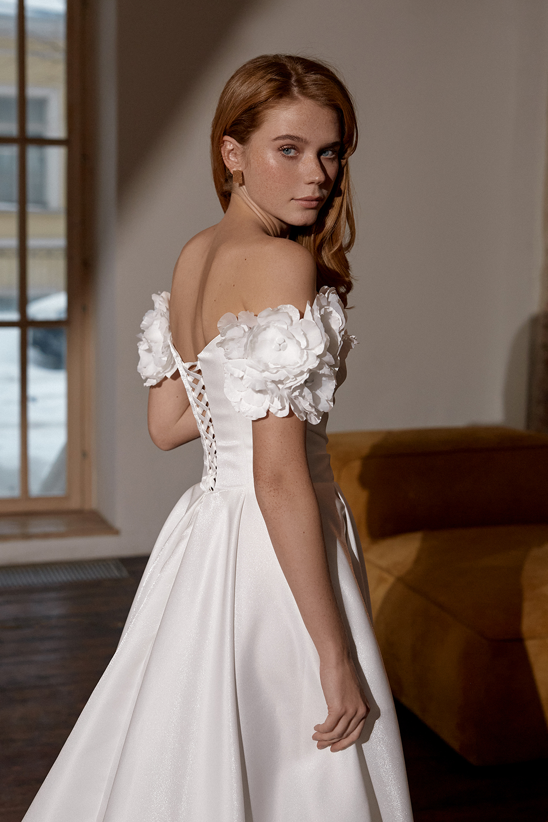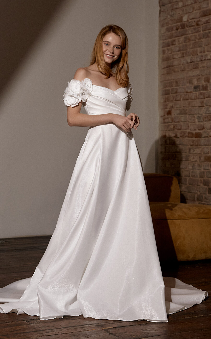 Свадебное платье А-силуэт подчеркивает фигуру, создавая изящный и утонченный образ. Открытые плечи добавляют нотку нежности, а ниспадающие рукава, украшенные акцентными цветами, придают уникальность и шарм.