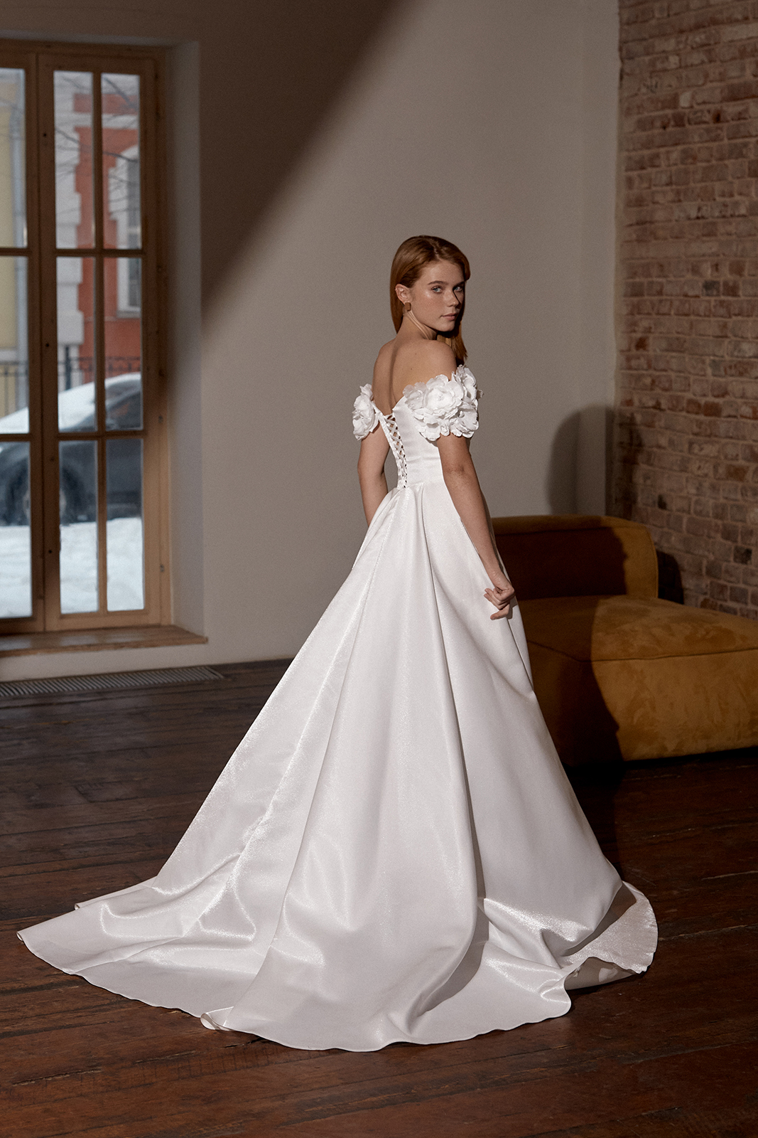 Атласное свадебное платье с открытыми плечами Freda – дорогой блеск атласа и романтичный силуэт