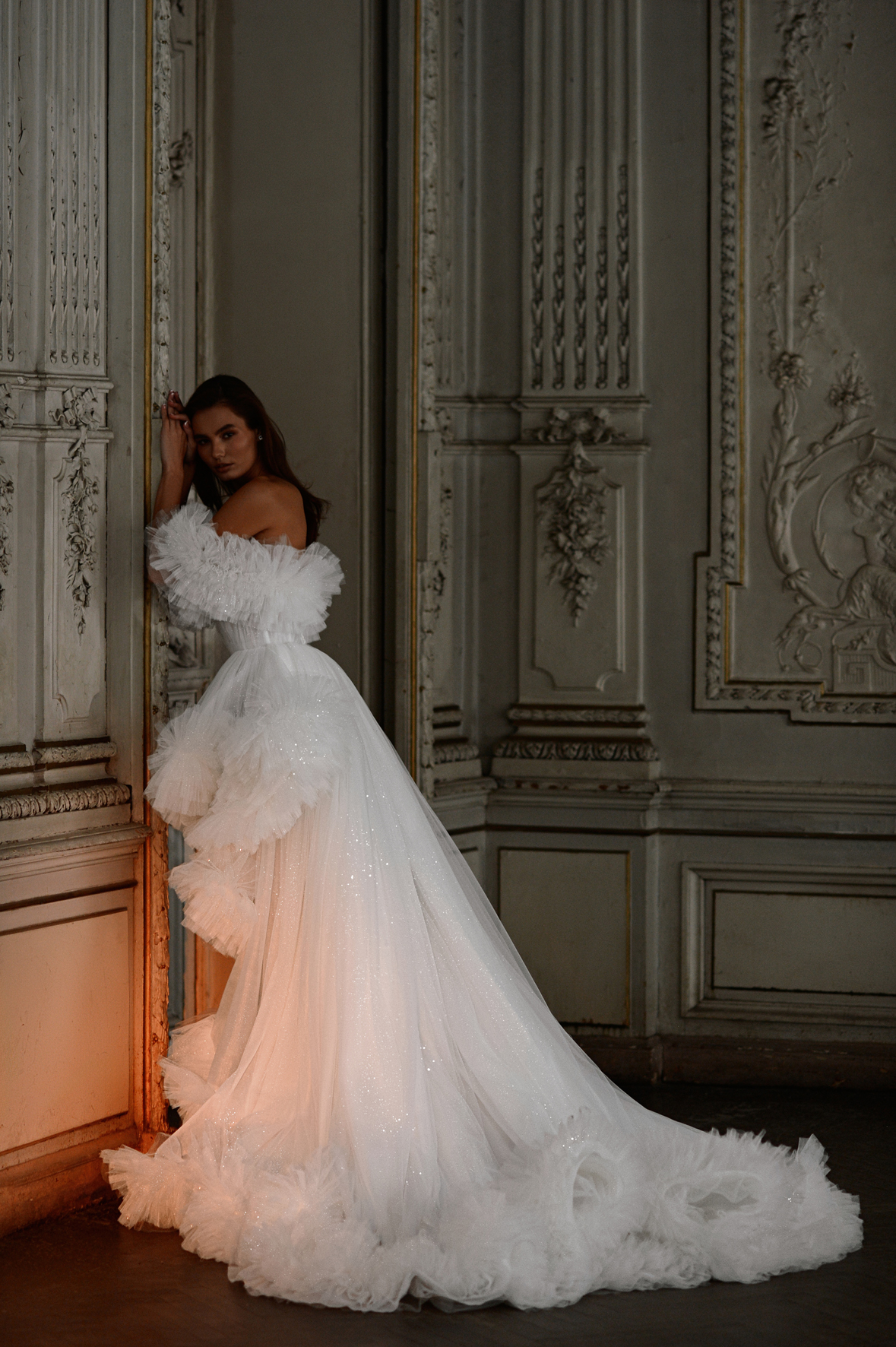 Хотите образ “не как у всех”? Блестящее свадебное платье Luxury – ваш выбор! Необычный верх, ниспадающие рукава и шлейф, украшенные тысячей оборок, подчеркивают индивидуальность наряда и дарят невесте изящество и воздушность.