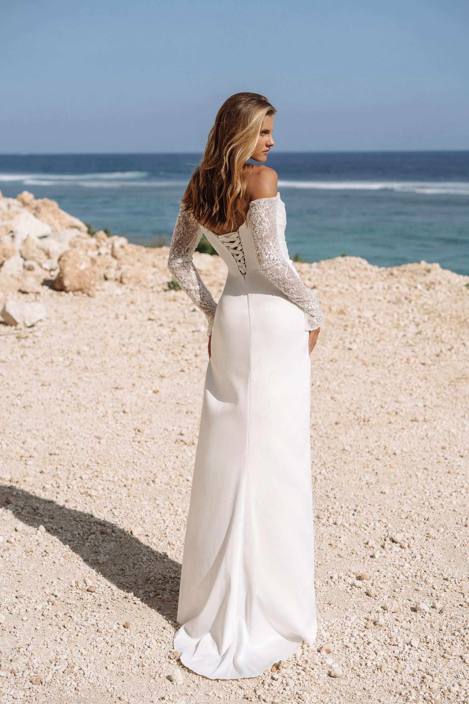 Свадебные платья, приталенные по фигуре типа Sinatra изготавливается из роскошного атласа, который идеально облегает фигуру, подчеркивая все достоинства силуэта. Спущенные кружевные рукава добавляют изысканности и легкости, создавая нежный образ. Свадебные платья с открытым декольте выглядят довольно смело. Высокий разрез на юбке демонстрирует ноги и подчеркивает грацию движений.